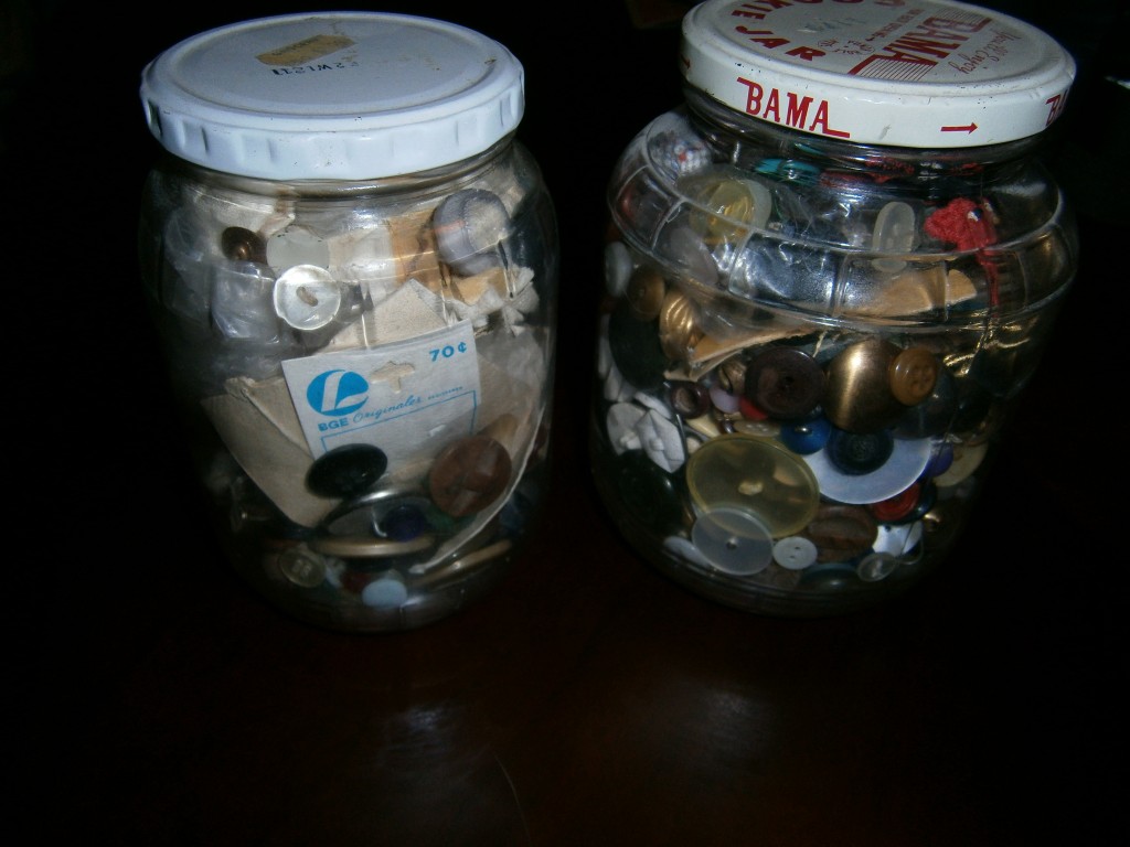 On October 30, 1926, my Grandma was born on Beggars’ night. She was the first child of Raymond F. Durbin and Ula Mae Akin Durbin. She told me that Beggars Night was the “treat” portion of Trick or Treat years ago. From the research I have done, it is mainly a midwest tradition. My Great Grandfather Raymond F. Durbin was originally from Illinois. The children would dress in their costumes and make evening rounds to homes and sometimes businesses. Gathering treats and sometimes they would receive things like buttons, and old jewelry. She collected these two jars for decades, full of little treasures and gave them to me years ago.