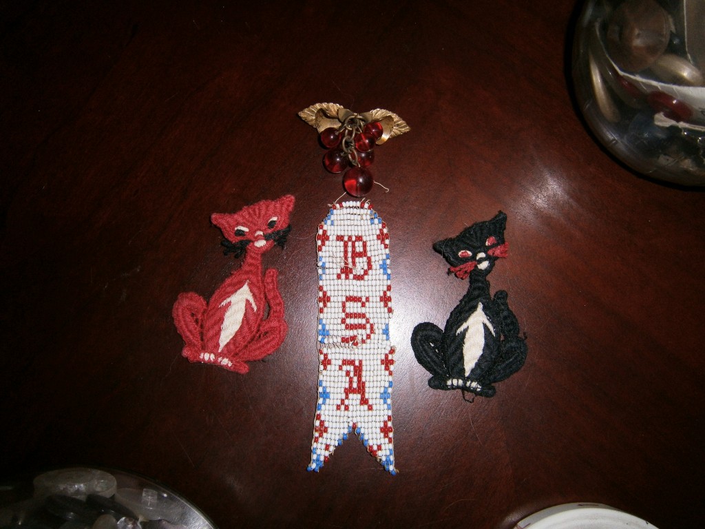She would joke about not knowing exactly was in there, she had collected these as a child and young adult and maybe there might be a $20.00 in one. Tonight I dusted off these old jars and just took out a couple things from the top. Found a beautiful beaded ribbon with the letters BS on it, two fabric cats and a gold broach with red dangling beads in great condition. I placed all these lovely memories back in the jars. Things she had collected from Beggars’ night, her birthday, her own little time capsule.