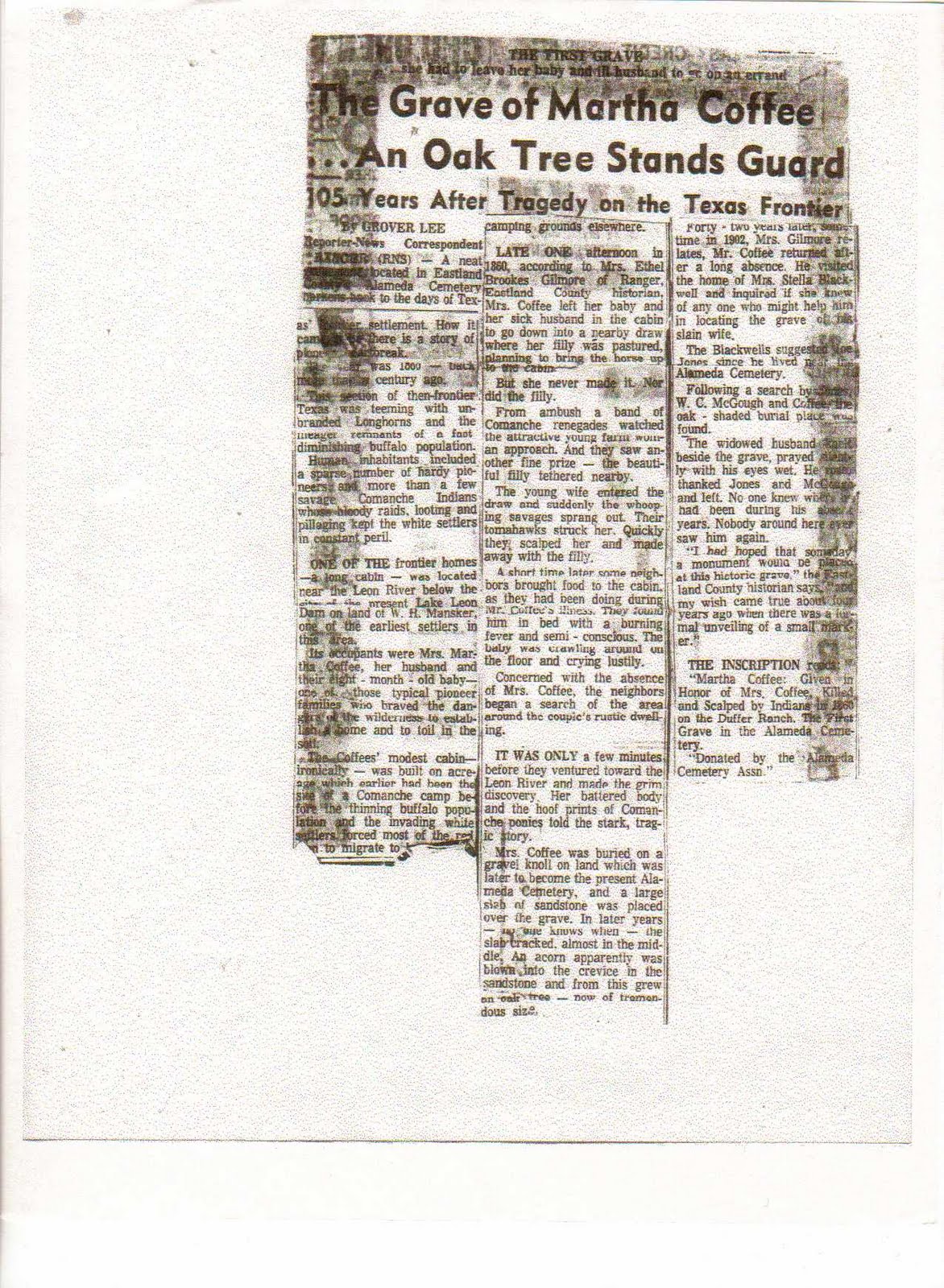 Recently I was going through papers that my mom had given me years ago. I came across a copy of an old newspaper article on Martha Coffee. This was a name I had not come across on any of the other documents. I sat and read about this young mother who while tending to her sick husband and young infant went down to the creek to gather the horses when she was attacked by Commanche Indians and Murdered. Her scalped body found later by neighbors who came by to check on the young family.